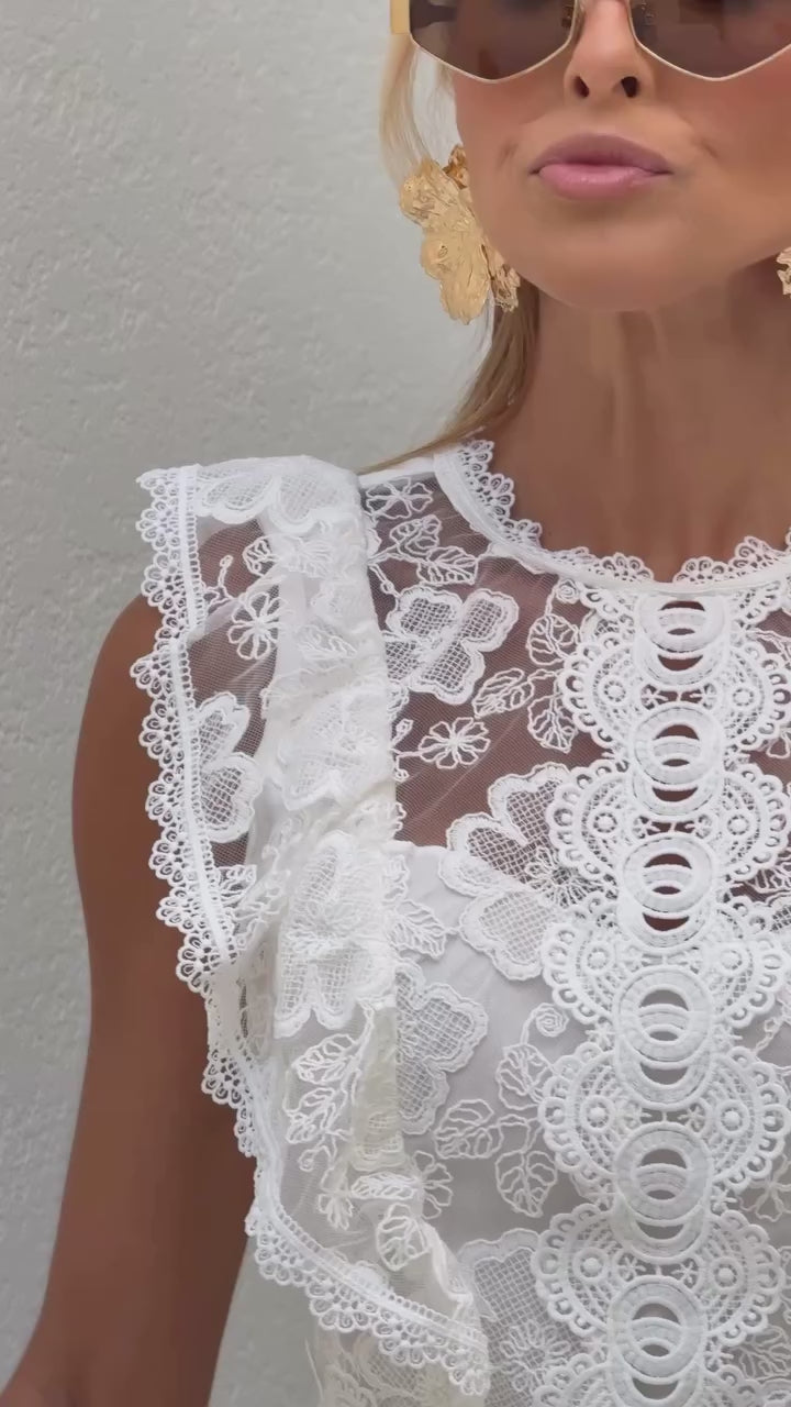 A peça possui aplicação de Renda Guipure na frente e na cintura, dando um toque ultra feminino e romântico.