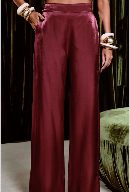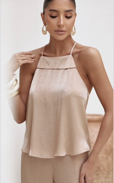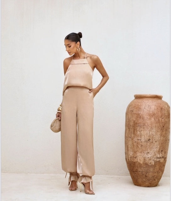 Conjunto composto por Calça e Regata, confeccionados em Crepe Acetinado com leve brilho, e corte em alfaiataria.